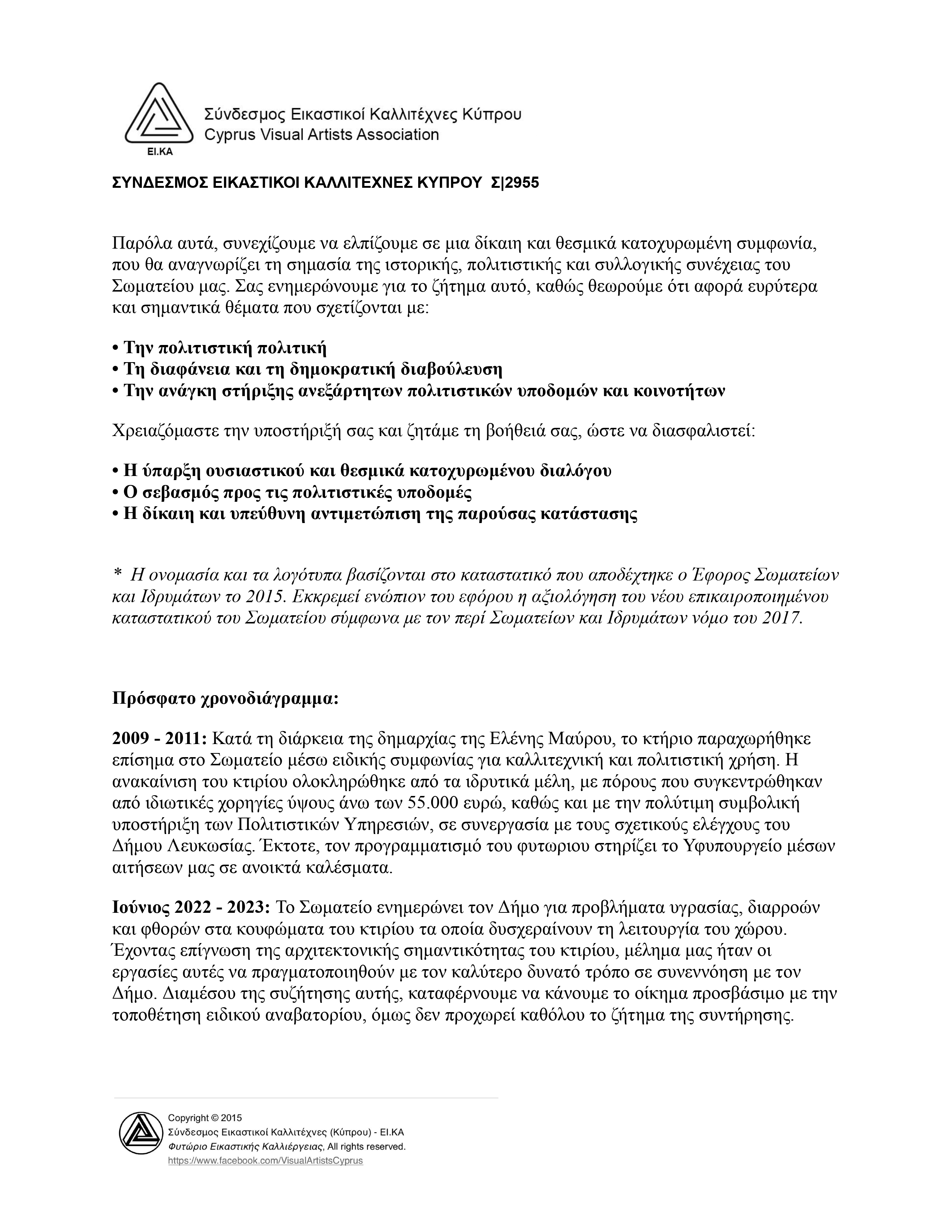 Έκτακτη Ενημέρωση για αιφνίδια ενέργεια του Δήμου Λευκωσίας που αφορά το οίκημα του Σωματείου Εικαστικών Καλλιτεχνών και Θεωρητικών Τέχνης (ΕΙ.ΚΑ)